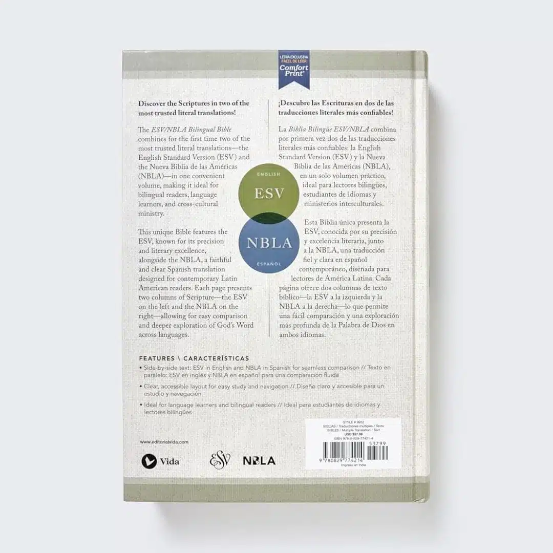 ¡Descubre las Escrituras en las dos traducciones literales más confiables! La ESV/NBLA Biblia Bilingüe combina por primera vez las dos traducciones literales más confiables, la English Standard Version (ESV) y la Nueva Biblia de las Américas (NBLA), en un solo volumen, ideal para lectores bilingües, estudiantes de idiomas y ministerios interculturales. Esta Biblia única presenta la ESV, conocida en inglés por su precisión y excelencia literaria, junto a la NBLA, una traducción fiel y clara en español contemporáneo, diseñada para lectores de América Latina.