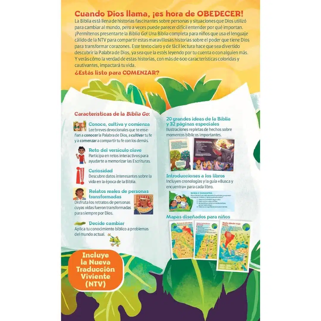 La Biblia GO está llena de contenido divertido y atractivo para ayudar a los niños a explorar la Palabra de Dios y a compartirla con los demás. Con el texto claro, preciso y fácil de leer de la Nueva Traducción Viviente, esta Biblia para niños planta la semilla de la fe y comparte el amor transformador de Dios con los pequeños a través de más de 600 características centradas en el tema de la transformación.