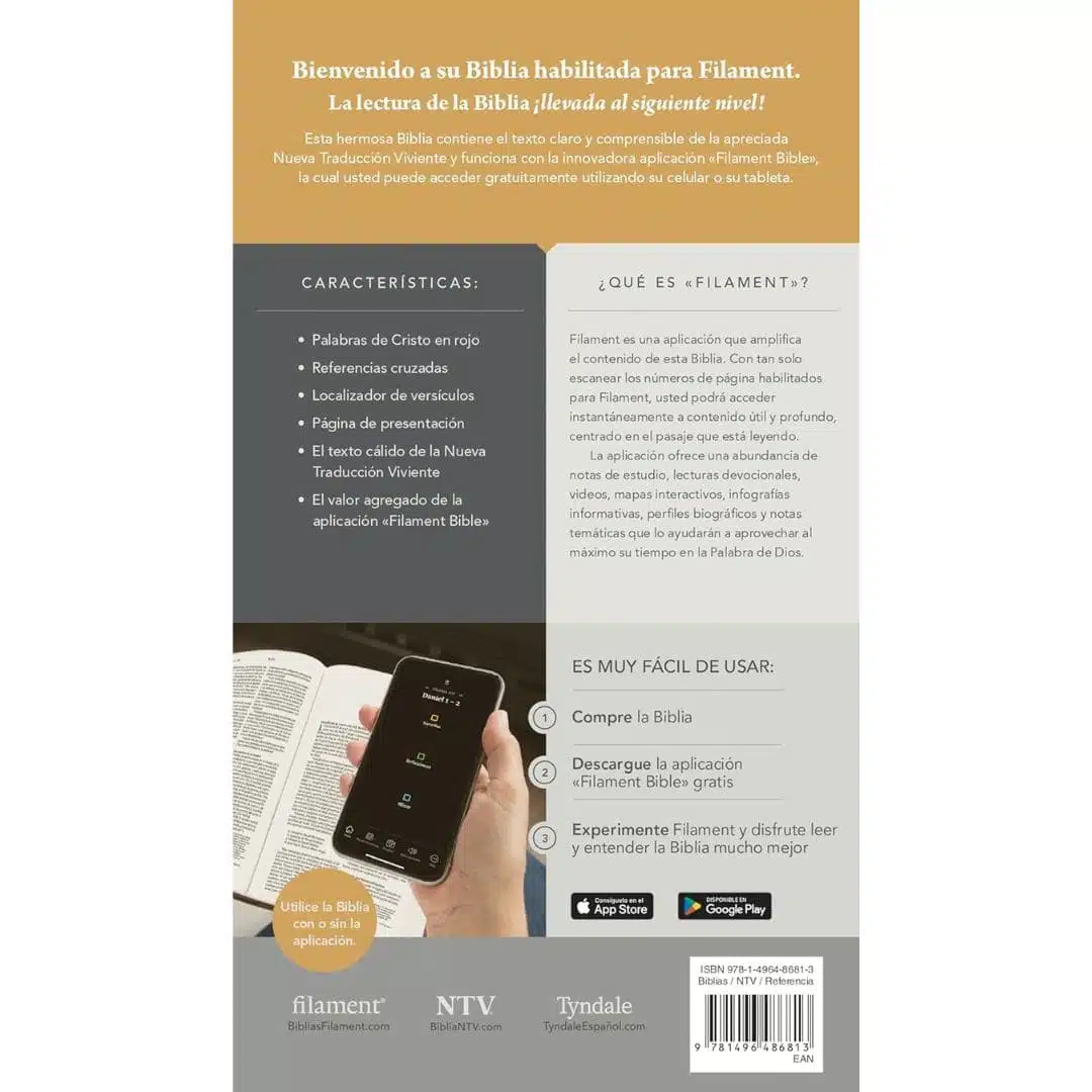 La nueva Biblia ultrafina NTV con Filament de Tyndale ofrece un texto legible, un diseño atractivo y referencias cruzadas en una Biblia delgada con un tamaño fácil de transportar. Y aunque tiene el mismo precio cómodo de las Biblias básicas de texto, la Biblia ultrafina NTV ofrece mucho más, al incluir la innovadora aplicación «Filament Bible». Esta aplicación le permite utilizar su teléfono móvil o tableta para conectar cada página a una amplia gama de contenido relacionado con la Biblia.