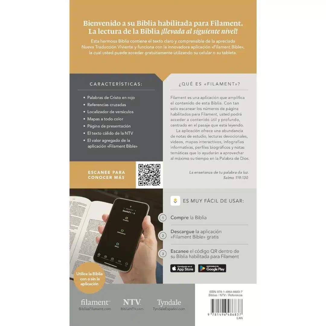 La nueva Biblia ultrafina NTV con Filament de Tyndale ofrece un texto legible, un diseño atractivo y referencias cruzadas en una Biblia delgada con un tamaño fácil de transportar. Y aunque tiene el mismo precio cómodo de las Biblias básicas de texto, la Biblia ultrafina NTV ofrece mucho más, al incluir la innovadora aplicación «Filament Bible». Esta aplicación le permite utilizar su teléfono móvil o tableta para conectar cada página a una amplia gama de contenido relacionado con la Biblia.
