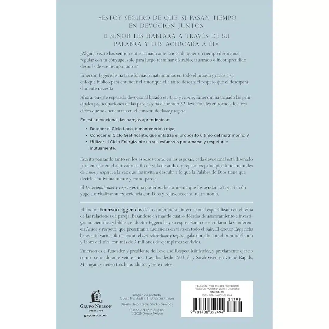 Basado en el best seller Amor y Respeto, con millones de copias vendidas, este devocional semanal ayuda a las parejas a fortalecer su relación al explorar la conexión entre el amor y el respeto. Cada capítulo concluye con una oración y un llamado a la acción para cultivar estos valores en su matrimonio.