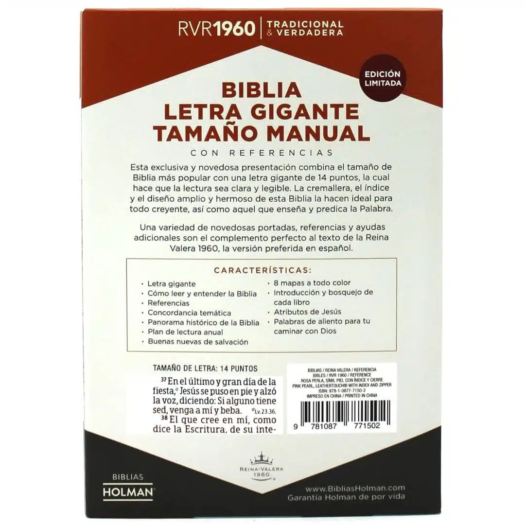 Santa Biblia, Reina Valera 1960, letra gigante, piel, manual, con cierre e índice, rosa perla